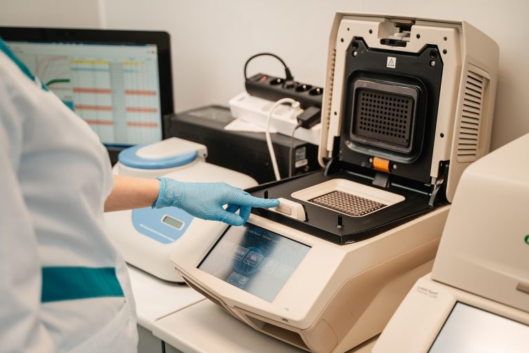 Зона выделения ДНК/РНК стерильна, здесь не допускается контаминация образцов — их загрязнение. Лаборатория оснащена всем необходимым оборудованием. Из первичного биоматериала получают нуклеиновые кислоты. Весь материал проходит через передаточное окно в зону детекции, где специалист в подготовленные образцы раскапывает реакционные смеси. И далее на приборах CFX96 проводится амплификация, то есть многократное увеличение числа копий фрагмента нуклеиновых кислот (ДНК/РНК), что позволяет обнаруживать специфичный участок генома возбудителя и идентифицировать его. Метод полимеразной цепной реакции позволяет находить даже следы ДНК и РНК вирусов. Результаты готовы уже через несколько часов.