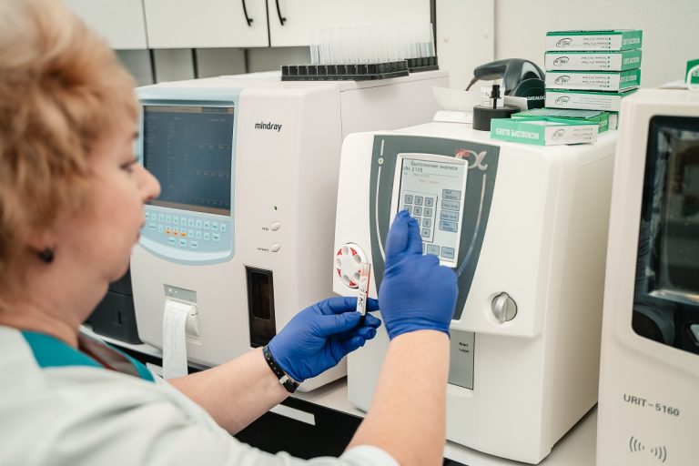 Пробирки для клинического анализа крови поступают в отдел гематологии. Лаборант сканирует штрих-код, задание поступает на анализаторы URIT-5160, Swelab-alfa, Mindray BC-760. Автоматическим методом определяется 25 показателей крови: СОЭ, гемоглобин, количество эритроцитов, тромбоцитов, лейкоцитов, эритроцитарные, тромбоцитарные индексы и другие. После того, как образец проанализирован, результат поступает в ЛИС автоматически.