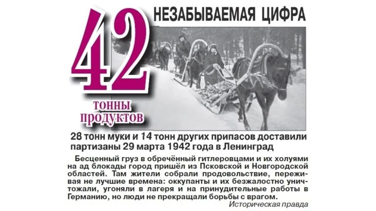 5 марта 1942 года. Партизаны и колхозники Ленинградского партизанского края в ознаменование 24-й годовщины Красной Армии отправили в осажденный город Ленина продовольствие. 5 марта из деревни Нивки, Дедовичского района, под охраной партизан вышел обоз из 223 подвод. Среди возчиков было 30 женщин-колхозниц. Обоз сопровождала делегация, которая везла защитникам Ленинграда письмо, подписанное более чем 3 тыс. партизан и колхозников. Обоз двигался ночью через глухие леса и болота и благополучно пересек линию фронта.