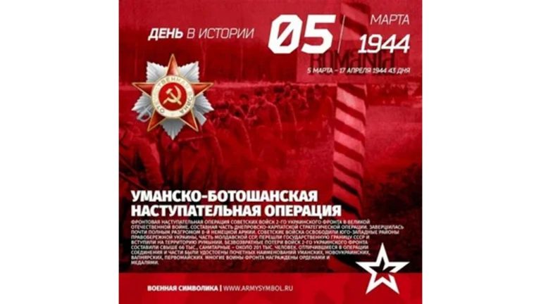 5 марта 1943 года. Началась Уманско-Ботошанская наступательная операция войск 2-го Украинского фронта, продолжавшаяся до 17 апреля 1944 года. На участке прорыва была проведена разведка боем с целью уточнения переднего края обороны противника. Чтобы замаскировать участки предстоящего прорыва, разведка боем проводилась по всей полосе фронта.