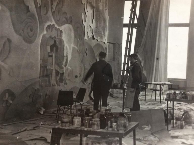 Работа художников над росписью. На снимке: Борис Запруднов и Всеволод Солодов. Николай Дочкин их фотографирует. Фото: dochkin.ru.