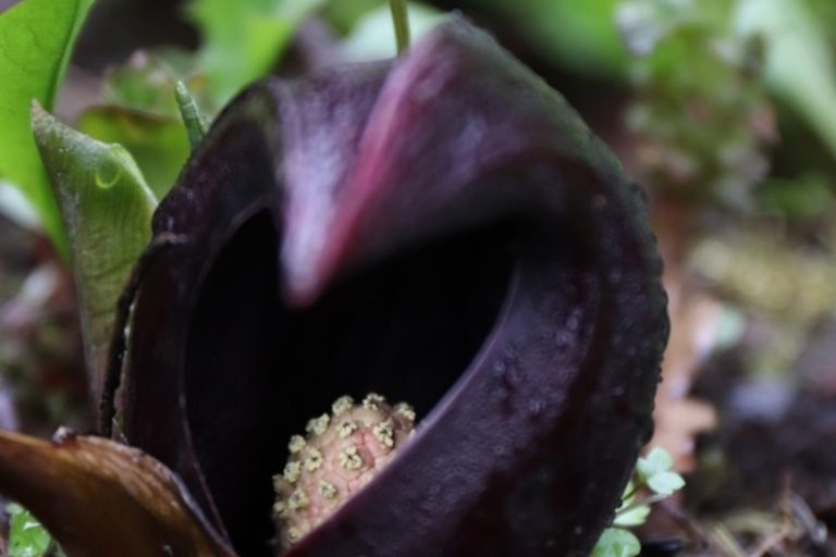 Симплокарпус прячет соцветие-початок под необычным тёмно-бордовым клювообразным покрывалом, похожим на капюшон или шлем. Это даёт защиту от переменчивой весенней погоды. Через неделю после зацветания начинают отрастать крупные розеточные листья.