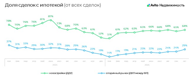 Технологическая платформа «Авито Недвижимость» подвела итоги октября 2025 года на ипотечном рынке в России. На первичном рынке доля сделок с использованием кредитного инструмента составила 68% (+3 п.п. к сентябрю и +17 п.п. к январю)*. Такая динамика связана с постепенным снижением ключевой ставки, из-за чего ипотека стала доступнее, а проценты по вкладам ниже. Вероятно, это привело к оттоку средств с депозитов и использованию их в качестве первоначального взноса для покупки жилья. Также росту сделок способствовало анонсирование решения властей ограничить возможности использования Семейной ипотеки с февраля следующего года: родители ребенка до 6 лет смогут покупать только один объект с применением льготной ставки (сейчас это может сделать каждый из супругов и при использовании определенной схемы купить два объекта).