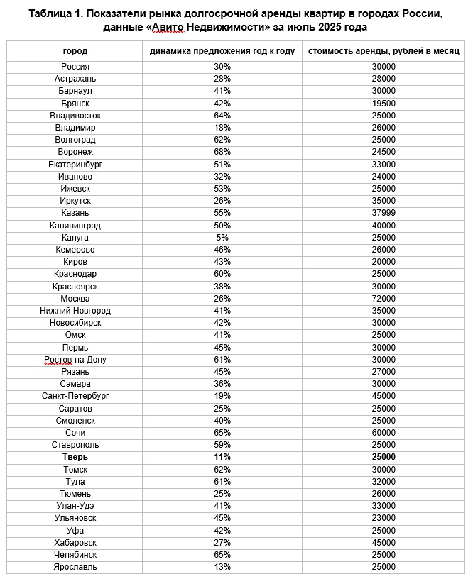 Аналитики «Авито Недвижимости» подвели итоги июля 2025 года на рынке долгосрочной аренды квартир в России. За год цены на долгосрочную аренду квартир в Твери уменьшились на 4%. Средняя стоимость аренды квартиры в регионе составила 25 тыс рублей. Дешевле всего по итогам июля 2025 года аренда жилья стоила в Брянске (19,5 тысяч рублей в месяц), Иванове (24 тыс. рублей) и Воронеже (24,5 тыс. рублей). Самые высокие средние цены аналитики отметили в Москве (72 тыс. рублей) и Санкт-Петербурге. Информация по другим городам — в таблице 1.