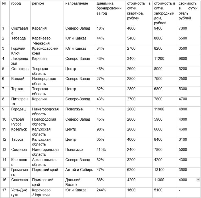 Средняя стоимость бронирования квартир в Осташкове составила 2600 рублей в сутки, а в Торжке — 2800, в то время как бронирование загородных домов достигло 8000 рублей в сутки и 6800 соответственно. Забронировать номер в отеле можно было в среднем за 5300-6200 рублей в сутки.