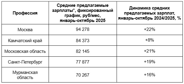 Рейтинг регионов по самой высокой средней предлагаемой заработной плате бухгалтеров, январь-октябрь 2024/2025: