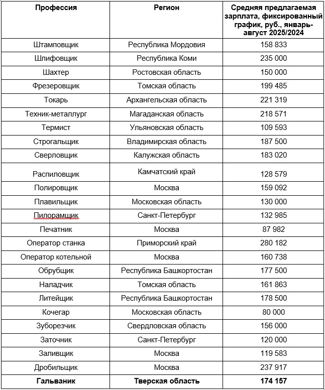 Регионы с самыми высокими средними зарплатными предложениями для разных специалистов из сферы металлургии, январь-август 2025/2024:
