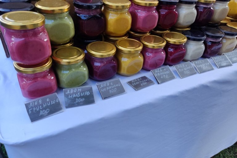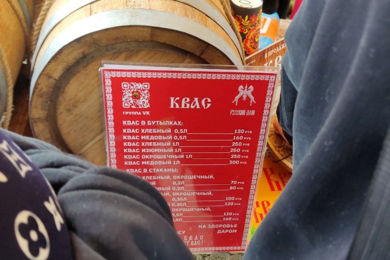 Так, за пол-литра кваса обойдется от 130 рублей, компот стоит 150 рублей, стакан чая из самовара или Иван-чая – 100 рублей, чай Ассам-лимон или Улун-персик — 320 рублей, пол-литровая бутылка воды — 100 рублей, кофе — 250-300 рублей, маленькая баночка меда — от 270 до 350 рублей.