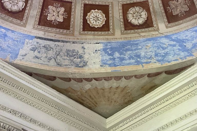Еще одна чудесная находка – это часть росписи, которую специалисты обнаружили под синей масляной краской, которой покрыли этот чудесный орнамент в советское время. Она хоть и повредила цветочный орнамент, но, к счастью, не уничтожила его совсем.