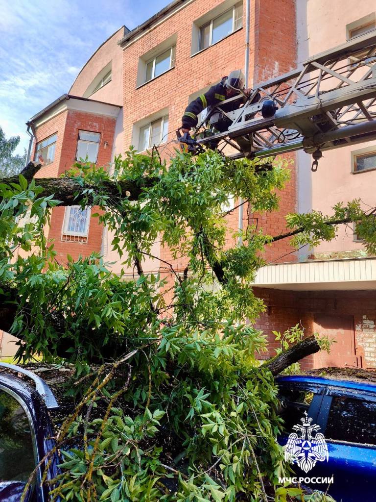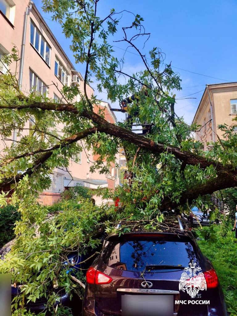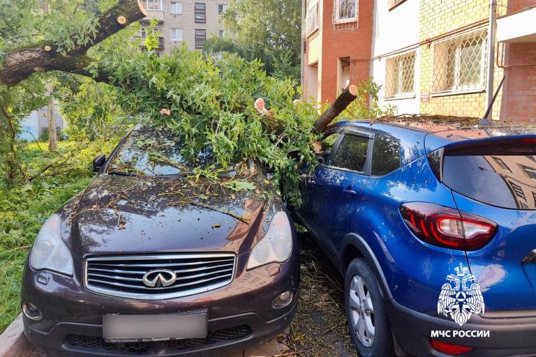 Еще одной точкой, куда выехали спасатели, стал двор на улице Бебеля, где дерево рухнуло на припаркованные автомобили, в том числе на Infiniti.