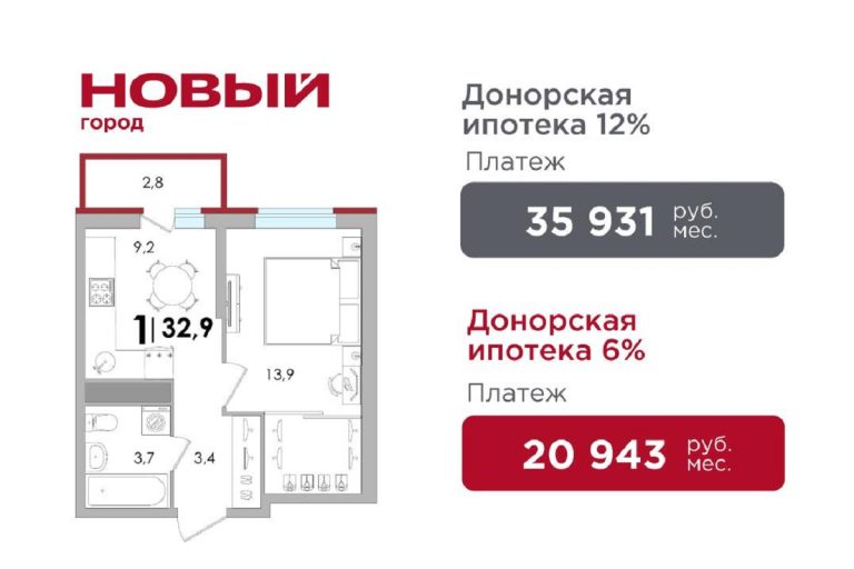 Например, уютная 1-комнатная квартира 32,9 м2 с гардеробной доступна с платежом всего 20 943 руб/мес, который может вырасти сразу до 35 931 руб/мес при ставке 12%.