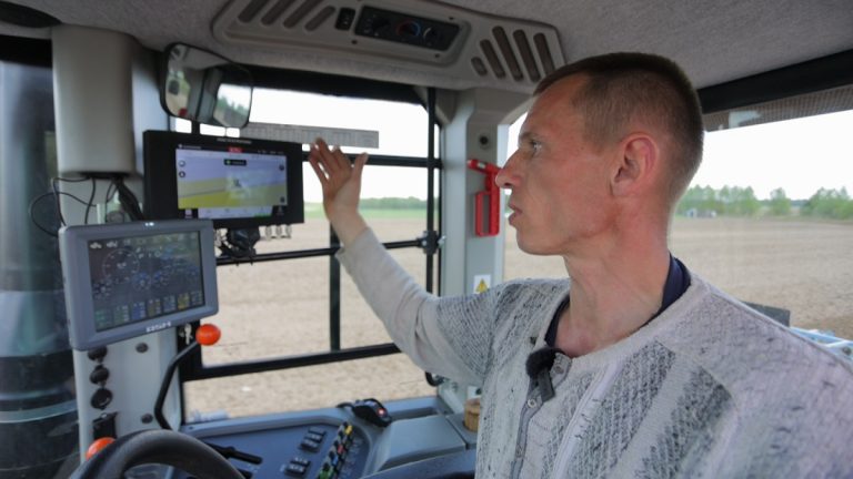 — Здесь установлена электронная система автоуправления РСМ Агротроник Пилот 1.0, по-простому – «автопилот». На мониторе создаю линии: отмечаю точку А, точку В, нажимаю ОК, и система автоматом отбивает передвижение трактора по полю. Я отпускаю руль, и он едет сам! Как надо! Праволинейно, по прямой, без всяких кривых линий и огрехов, — доходчиво объясняет механизатор колхоза «Мир» Дмитрий Голубков.