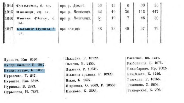 Одна из этих деревень — деревня Большие Пупцы или же Большие Пупсы. Она находится в Рамешковском округе и сегодня составляет часть села Заклинье. Вторая деревня — это деревня Безумово в Зубцовском районе Тверской области.