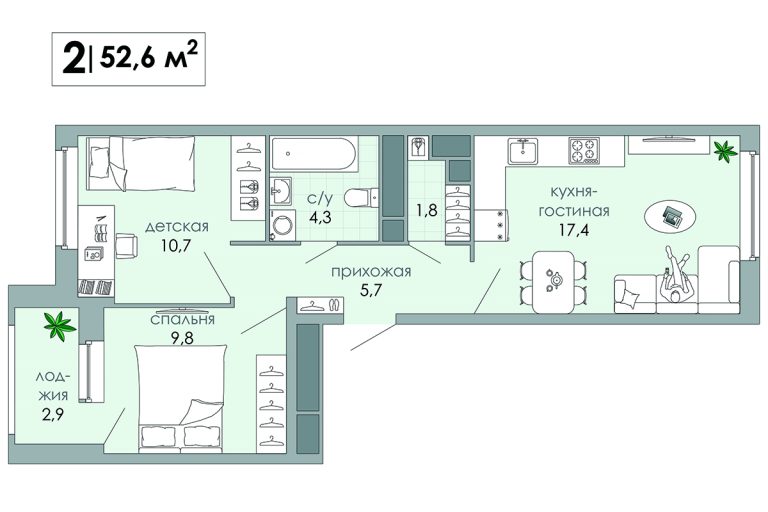 А просторная 2-комнатная квартира “на вырост” площадью 52,6 м2 с отдельной гардеробной и большой кухней-гостиной обойдется всего в 26 779 руб/мес.