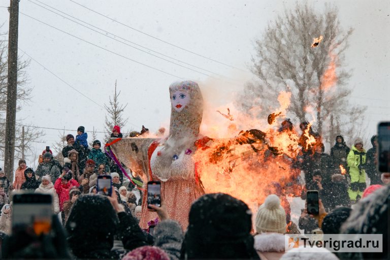 Близилась кульминация — сожжение большого чучела, энергии которого, казалось, хватит на всех. Гостей попросили собраться. Снежные горки превратились в удобные обзорные площадки, люди амфитеатром разместились на них, выбирая лучший ракурс. Только за день усадьбу посетили более 2000 человек. Под звонкие песни пламя быстро охватило соломенную фигуру.