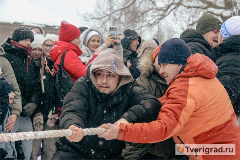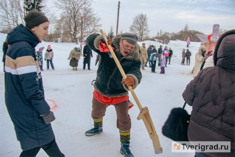 Почти все собравшиеся поучаствовали в одной занятной игре. Нужно было встать в круг, включалась музыка, а как только она обрывалась — втолкнуть соседа внутрь. Ведущие ходили с деревянной лопатой и легонько шлёпали тех, кто оказывался в центре. Забава подходила для любого возраста и действительно разгоняла холод. Подплясывали даже пенсионеры. Например, подруги Тамара, Татьяна и Евгения из Твери остались в восторге от этого дня.