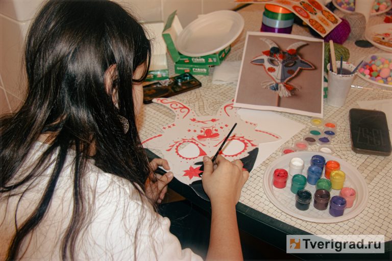 Делали и паузы, чтобы публика не «перегрелась». Спрятаться от ветра и снега можно было на мастер-классах. Когда туда зашла я, зал оказался заполнен детьми — они мастерили праздничные маски. Ранее желающие изготавливали оберег в виде лошади ручной работы.