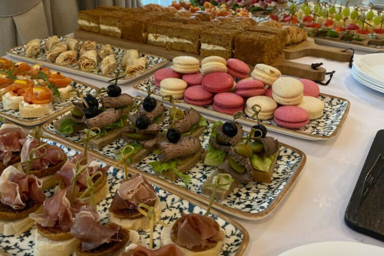 Можно ограничиться кофе-брейком (здесь предлагают 5 вариантов такого формата); либо накормить гостей комплексным обедом в интерьере ресторана, сочетающего классику и современность; либо сделать фуршет в уютном главном холле с камином; либо накрыть столы в отдельном банкетном зале на 100 посадочных мест. Можно также сочетать разные варианты: всё обсуждается.