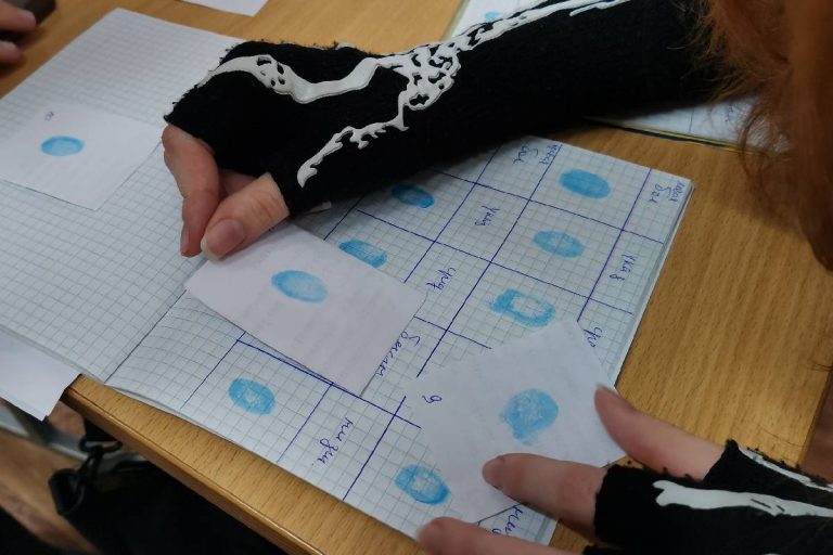 В целом программа кружка — это микс из химических экспериментов, математических расчетов и биологических подсказок. Тут учат правильно делать судебную фотографию, работать с ростомером, по следам определять рост человека. Но не только. Ребята, к примеру, уже снимали отпечатки пальцев (оказалось, это посложнее, чем в кино: «Краска потом плохо смывается,- говорит с улыбкой семиклассник Егор Ребецкий), «вычисляли» под микроскопом поддельные документы и даже составляли фоторобот — по программе, которая доступна в сети интернет. А ещё Шерлокам без плаща понравилось, как они слушали звуки с закрытыми глазами, а после воспроизводили их в последовательности (фоноскопия — исследование звуковых записей). «Оказалось, что всё это непросто запомнить», — отмечает десятиклассница Лена Собина.