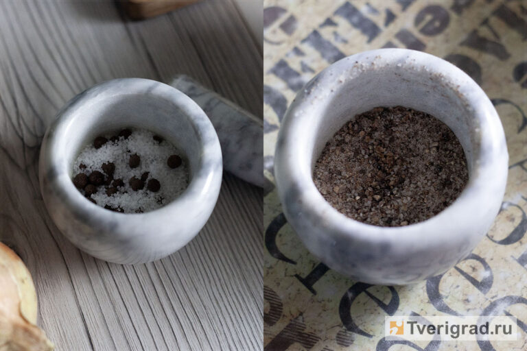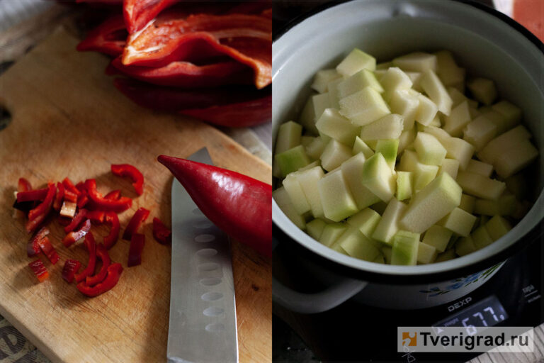 Ингредиенты готовим заранее. Кабачки нарезаем кубиками, перец очищаем от семечек и режем соломкой, лук — полукольцами или четвертинками. Заранее растираем в ступке черный перец горошком и душистый перец, а для того, чтобы это было сделать проще, добавляем чуть-чуть соли. И как только все ингредиенты готовы, приступаем к основному процессу.