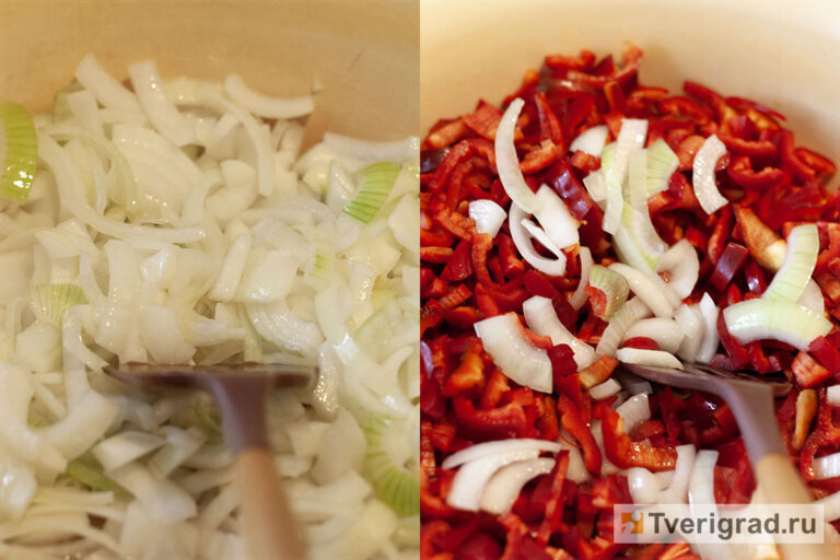 Сначала обжариваем лук в масле, пока он не станет золотистым. Затем добавляем в него болгарский перец.