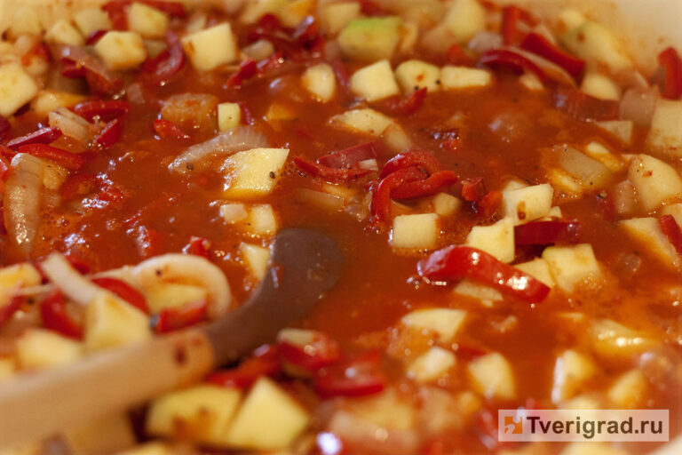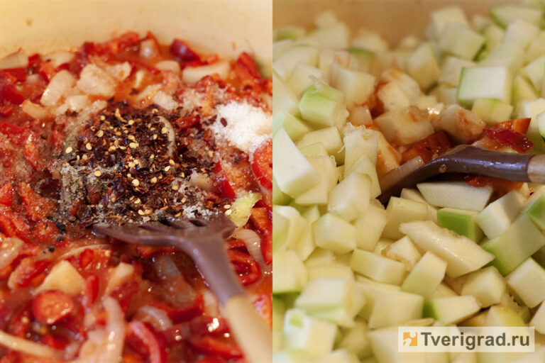 Приготовленной смеси из лука, перца, томатной заправки и специй нужно дать прогреться 5-7 минут. Затем добавляем кабачки и готовим их до тех пор, пока кубики не стану «стеклянными». Затем добавляем уксус и томим их ещё 5-7 минут.