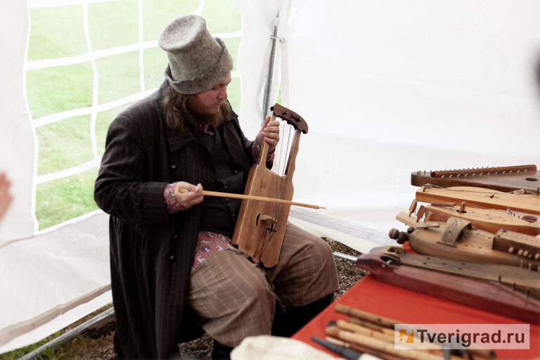 Из палатки рядом слышатся северным мотивы, наигрываемые на старинных музыкальных инструментах. Их сюда привёз специалист отдела творческих проектов Новгородского областного театрально-концертного агентства Антон Вакулов. Среди инструментов – колёсная лира, кантеле и инструмент, чем-то отдалённо напоминающий лиру, который носит интересное название — йоухикко.