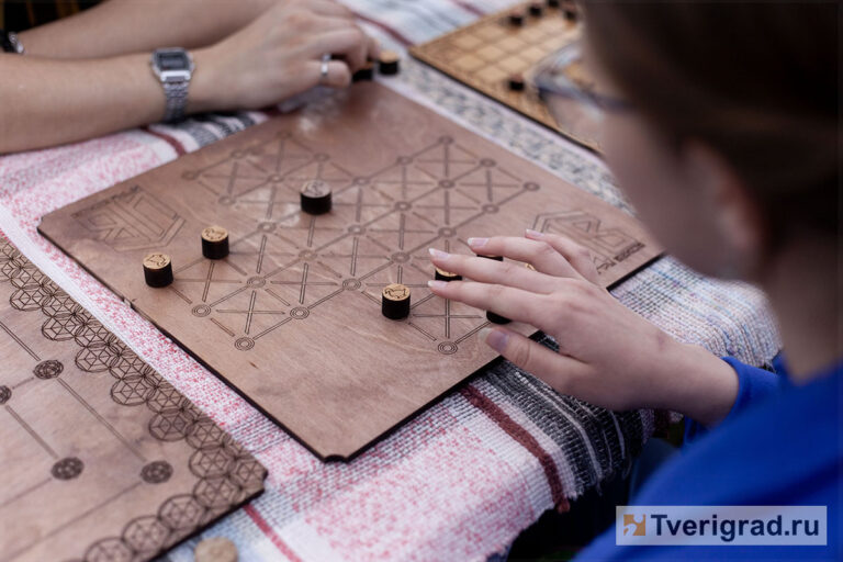 — Мы занимаемся изучением древнейшей истории Государства Российского и популяризацией через работу со взрослыми, с детьми, через мастер-классы и тому подобное. Здесь у нас выставлены пять игр. Четыре из них – средневековые. Это игра «Мельница». Игра «Лис и гуси». Игра «Тавлеи» или «Хнефтафль». И игра «Дальдоза». А между ники – царская игра «Ур», Месопотамия, четыре тысячи лет до нашей эры, — рассказал представитель клуба Алексей Мусинский.