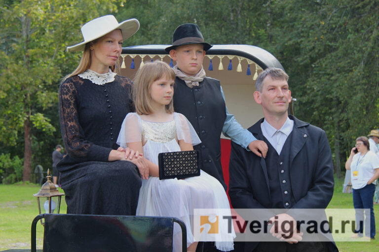 Иду дальше. Людей становится всё больше. Меня привлёк аккуратно одетый семейный квартет у музейной брички: мама и папа в фасонах XIX века, дочь и сын — неподвижные и сосредоточенные.