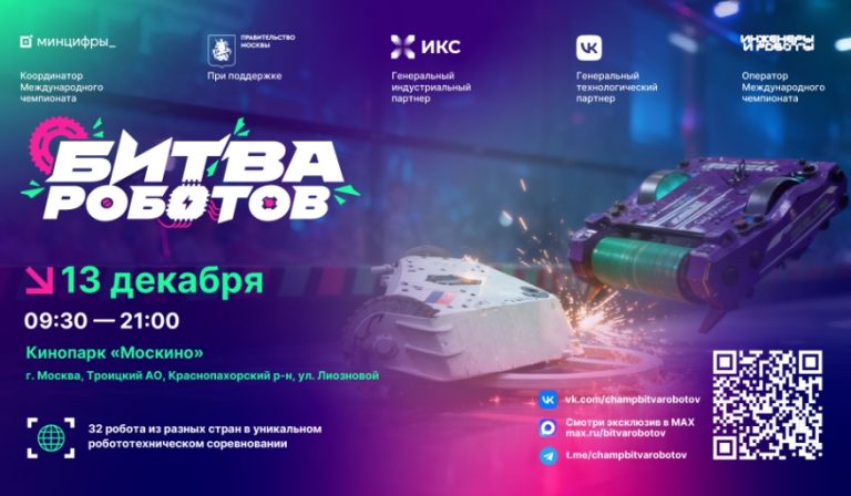 Все желающие смогут следить за событиями чемпионата онлайн по ссылке https://vkvideo.ru/video-219465931_456241089. В очном формате мероприятия пройдут по адресу: г. Москва, Троицкий АО, Краснопахорский р-н, ул. Лиозновой, кинопарк «Москино». Подробности – на сайте проекта https://bitvarobotov.tech/#schedule.