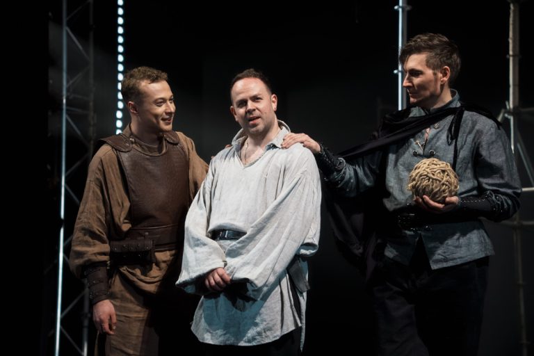 Сообразно версии Андрея Чернова, который не только старался приблизить дошедшие до нас шекспировские строчки двух фолио, но и написал несколько литературоведческих статей о пьесе, даже друг Гамлета – Горацио (арт. Сергей Грищенко) – не совсем друг. Во время одного из разговоров они даже фехтуют, оттачивая мастерство, словно стараясь уколоть друг друга. Именно Горацио в павлишинском прочтении вместо норвежского принца Фортинбраса должен принять бразды правления. Или отказаться, потому что это ему не по чину. «Быть или не быть?..»