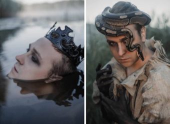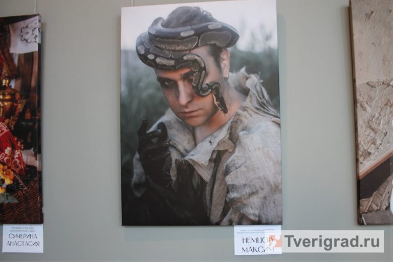 Конечно, взгляд сразу же цепляется за портрет режиссёра массовых мероприятий высшей категории ДК «Пролетарка» Максима Немцова. В сшитом своими руками из грубой рогожи костюме, с тенями вокруг глаз и венцом из змеи (да-да, живой рептилии!) тверичанин напоминает принца в изгнании. Царь природы, принёсший свою культуру! Что справедливо, т.к. на других фото есть и корона.