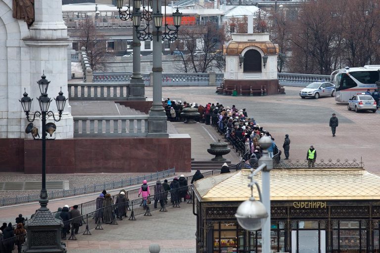 «…По сведениям информационных агентств сегодня днем в очереди к «Поясу Богородицы» стояли 82 тысячи человек. За дни, пока реликвия находится в Храме Христа Спасителя, его посетили уже около полумиллиона верующих. Чтобы не дать очереди расти бесконечно и хоть как-то оптимизировать процесс, сегодня ковчег с поясом поставили на высокую арку с тем, чтобы посетители храма просто проходили под ней в три-четыре ряда. Таким образом скорость прохождения достигла 80 человек в минуту.