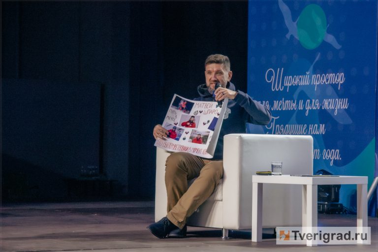 Были и те, кто решил оставить путешественнику память о встрече. Школьники из Бежецка передали рукотворный фан-плакат. Матвей Шпаро пообещал обязательно сфотографировать его на память и рассказать федеральному координатору «Движения Первых» о том, какие увлечённые и внимательные ребята растут в Тверской области. Ближе к концу встречи авторы самых интересных вопросов получили книгу. Та самая Таня — свою заслуженную, с улыбкой, которая не нуждалась в комментариях.