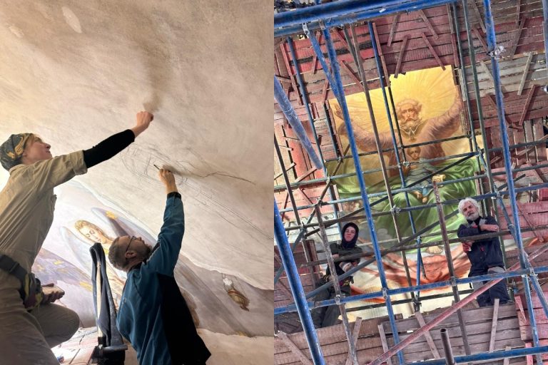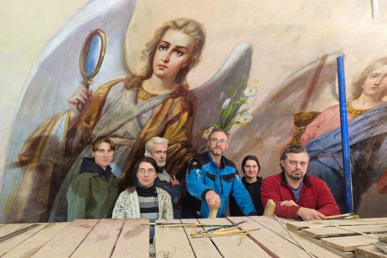 — Реставрация кажется очень хрупкой работой. Какой командой вы её ведёте, и какие условия необходимо выдерживать, чтобы вообще можно было работать с росписью в куполе?