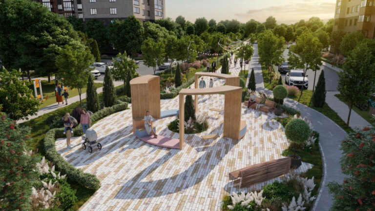 Озеленение продумано как система. Высокие деревья подарят тень, густые кустарники создадут ощущение приватности, живая изгородь отделит аллею от дворов, а цветочные клумбы и вазоны станут визуальным акцентом на всей её протяжённости.