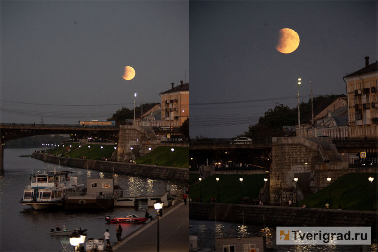Само затмение началось в 18:45 по Московскому времени. А в Твери Луна начала подниматься над горизонтом в 19:15, когда её левый край уже немного накрывала тень Земли. В центре города особенно удачной точкой для наблюдения за восходом Луны стала акватория реки Волги. Уже в 19:20 пока ещё бледная Луна возвышалась над Новым Волжским мостом.