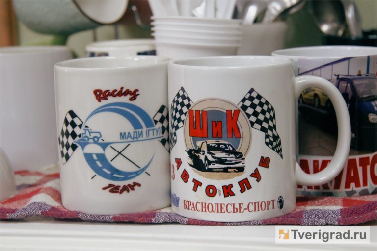 Даже кружки на небольшом холодильнике — с гоночной символикой.