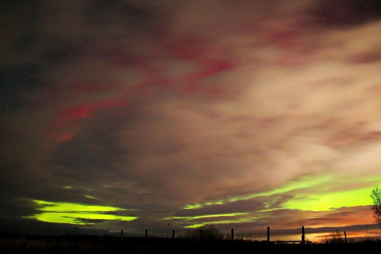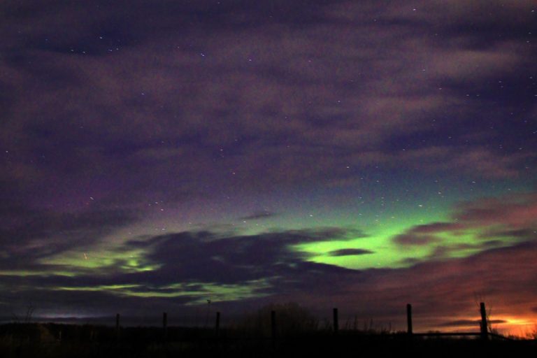 Магнитная буря была недолгой, но её хватило, чтобы северное сияние появилось даже в небе над нашим регионом. Правда, облака мешали наблюдать за ним.