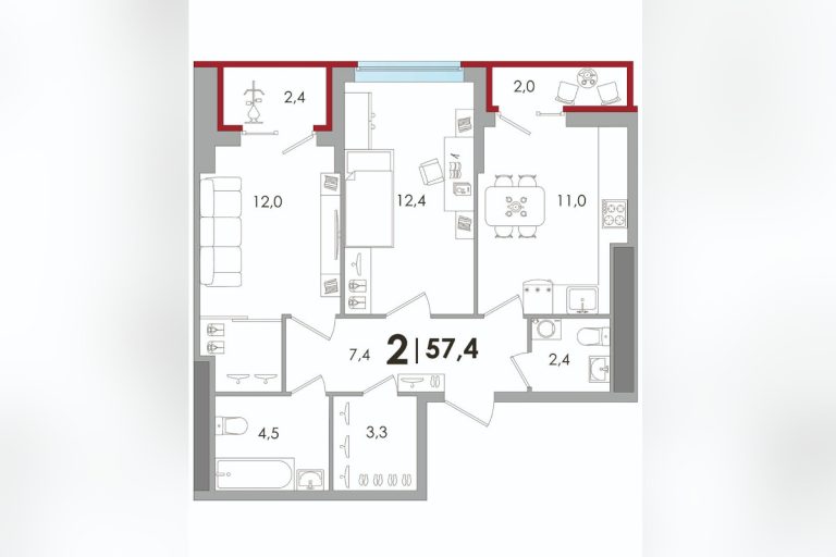 Хорошим вариантом для будущих родителей станет двухкомнатная квартира 57,4 квадратных метра. Ребёнку – отдельная детская, маме с папой – мастер-спальня. А ещё здесь просторная кухня с балконом, 2 санузла и большая прихожая с гардеробной.