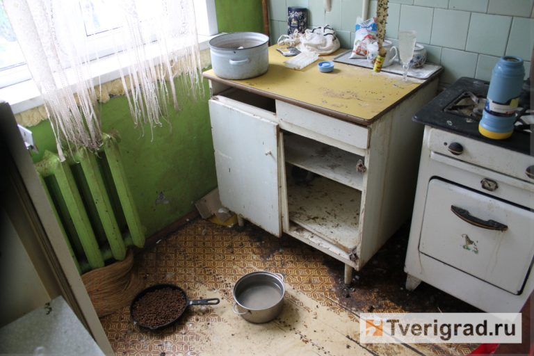 Слово «смрад» лучше всего описывает запах, который стоит в квартире – грязь на полу, частично заваленная мусором кладовка, отключённый холодильник, набитый продуктами, ванна, наполовину заполненная водой, видавший виды унитаз… Посреди коридора стоит жилец, размазывающий что-то по полу шваброй. Духота страшная.