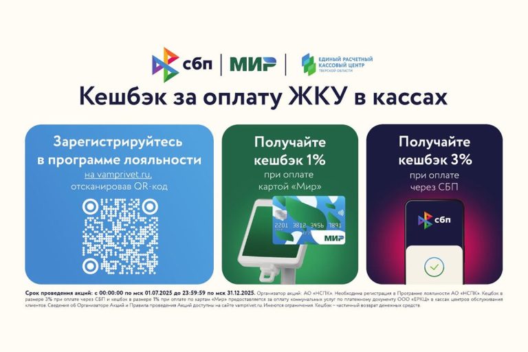 Единый расчетно-кассовый центр приглашает жителей г. Твери и Тверской области воспользоваться акциями «Кешбэк за оплату ЖКУ через СБП в ЕРКЦ города Твери и Тверской области» и «Кешбэк за оплату ЖКУ картой «Мир» в ЕРКЦ города Твери и Тверской области», которые будут действовать в период с 1 июля по 31 декабря 2025 года по мск.