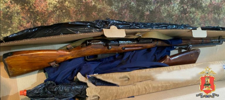 «Дома по месту жительства подозреваемого, а также в принадлежащем ему гараже и хозяйственной постройке полицейские обнаружили и изъяли более 400 патронов различного калибра, винтовку Мосина, карабин «Маузер», пистолет-пулемёт Шпагина, чехословацкий самозарядный пистолет CZ vz. 27, пистолет Люгера («Парабеллум»)»,