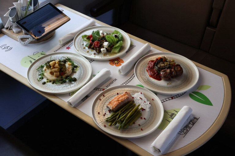 «Среди авторских новинок: салат из жареных баклажанов с мягким сыром, осетинский пирог с картофелем и сыром, говядина с овощами гриль, нежная форель со спаржей в сливочном соусе цахтон и семенами чиа», — рассказали о меню в РЖД.