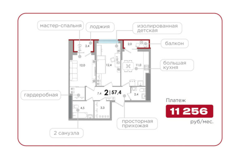 А семейная квартира с двумя изолированными спальнями в ЖК «Южный», которую вы рассматриваете для переезда, – 6 572 300 рублей. Разница составляет 2 472 300 рублей и, если покрыть эту сумму с помощью ипотеки 3,5%, ежемесячный платёж будет всего 11 256 рублей.