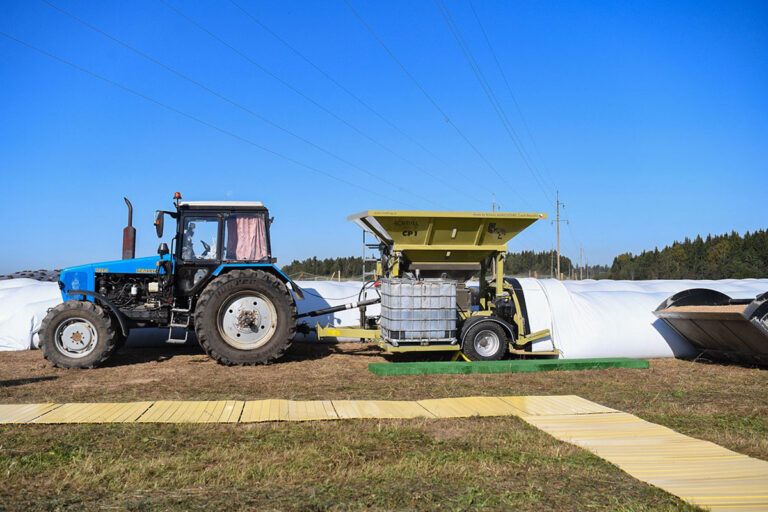 Как рассказал председатель колхоза Евгений Афанасьев, для хранения урожая и производства комбикормов используется технология плющения зерна: оно помещается в специальные рукава без доступа воздуха с добавлением бактериологической закваски или консервантов. Здесь идут процессы молочнокислого брожения и на выходе получается готовый продукт, что позволяет избежать дополнительных затрат на сушку и размол зерна.