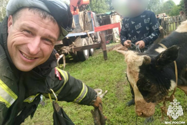 В деревне Бухарево Калининского округа бык провалился в бетонный колодец. На помощь ему пришли спасатели из ПСЧ-72.
