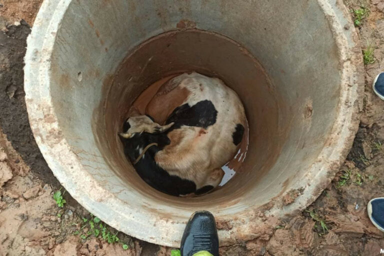 В деревне Бухарево Калининского округа бык провалился в бетонный колодец. На помощь ему пришли спасатели из ПСЧ-72.