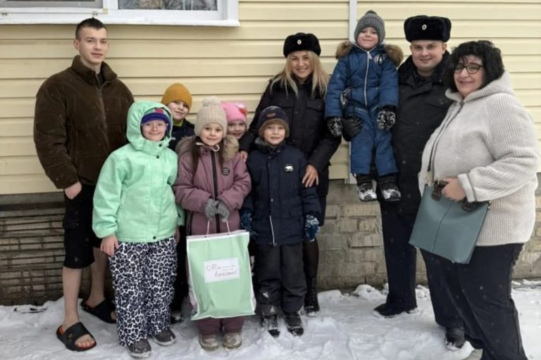 «Капитан полиции Марина Пулихина и капитан полиции Алексей Шерстюк совместно с председателем Общественного совета при ОМВД России «Калининский» Еленой Тарадиной навестили многодетную семью Трусовых, воспитывающих 14 детей»,