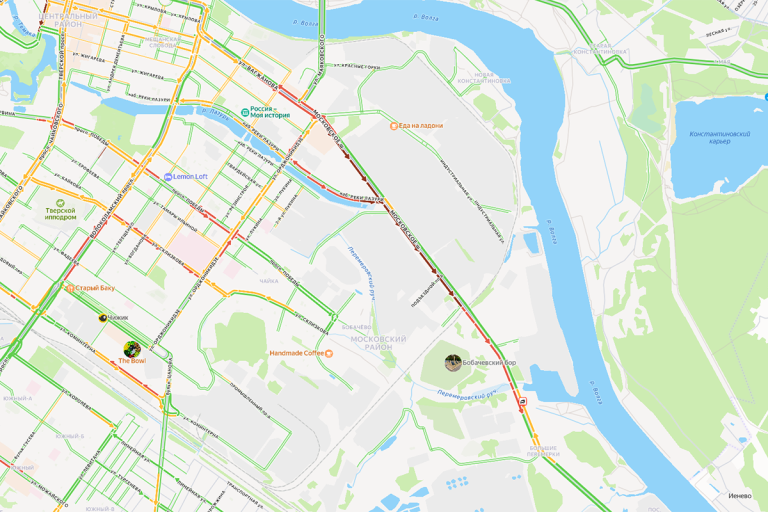 Напомним, около 9:20 там столкнулись самосвал КамАЗ и автобус ЛиАЗ, следовавший по маршруту № 223. В результате ДТП транспортные средства полностью заблокировали движение по Московскому шоссе в сторону посёлка Химинститута. По состоянию на 11:20 пробка усилилась, начинается она сразу от площади Гагарина.